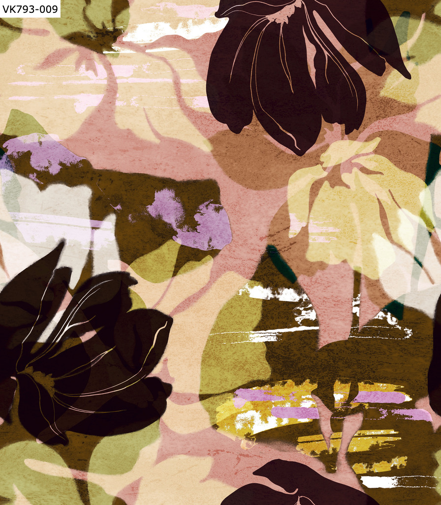 Collection of polyester and natural fabrics with sublimation printing and pigments.